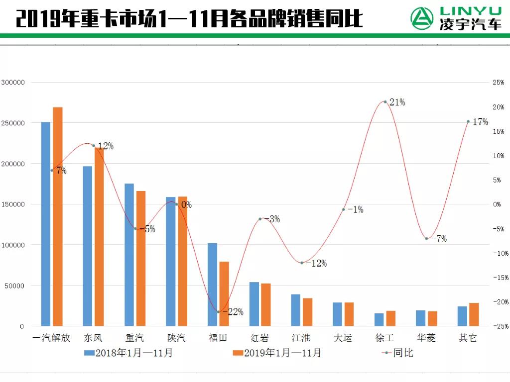 11月份過(guò)去后,今年1-11月的重卡市場(chǎng)累計(jì)銷(xiāo)量達(dá)到107.44萬(wàn)輛,比上年同期的106.53萬(wàn)輛小幅增長(zhǎng)1%。如果不出意外,2019年全年重卡市場(chǎng)的整體銷(xiāo)量將超過(guò)115萬(wàn)輛,從而刷新我國(guó)重卡行業(yè)年銷(xiāo)量的新紀(jì)錄。