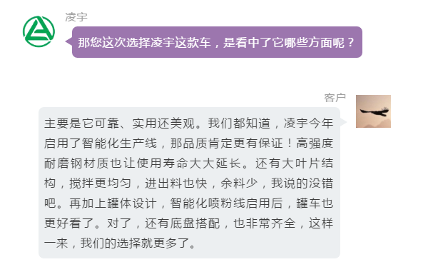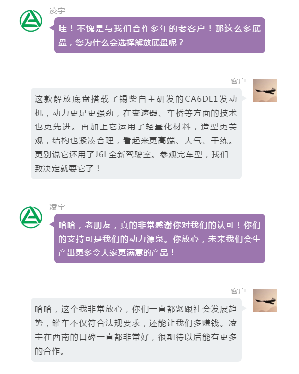 哈哈,這個(gè)我非常放心,你們一直都緊跟社會(huì)發(fā)展趨勢(shì),罐車(chē)不僅符合法規(guī)要求,還能讓我們多賺錢(qián)。凌宇在西南的口碑一直都非常好,很期待以后能有更多的合作。