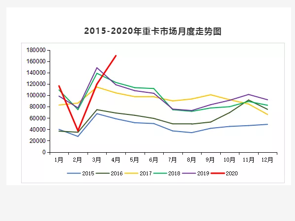 受疫情影響,2020年前四個(gè)月的重卡市場(chǎng),整體比較坎坷,呈現(xiàn)出V形走勢(shì)曲線。雖然1月份銷量創(chuàng)下歷史新高,同比增長(zhǎng)18.2%,取得了開門紅,但2、3月份市場(chǎng)連續(xù)出現(xiàn)大跌,分別同比下滑51.8%、19.3%;直到4月份,隨著新冠肺炎疫情對(duì)國(guó)內(nèi)經(jīng)濟(jì)的影響逐漸消退,市場(chǎng)才重回上升趨勢(shì),并且呈現(xiàn)出產(chǎn)銷兩旺的發(fā)展勢(shì)頭。