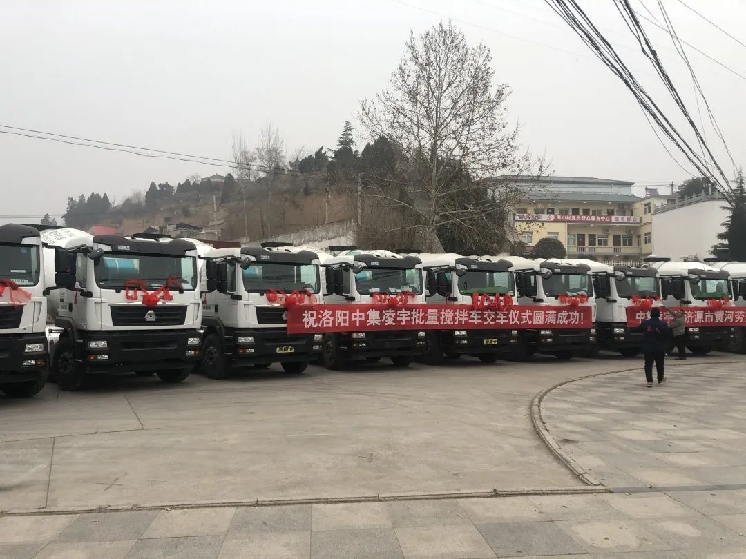 1月24日,中集凌宇為濟源老客戶舉辦的交車儀式上,13臺披紅戴花的凌宇攪拌車整體排列,蔚為壯觀。