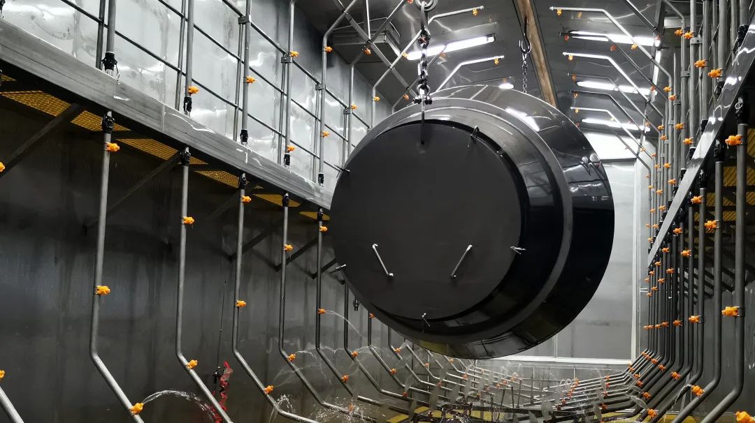升級版涂裝線為全自動噴粉涂裝生產(chǎn)線。和噴漆相比,更環(huán)保、節(jié)能、平整。它選用瑞士金馬靜電粉末噴涂系統(tǒng),通過全新激光輪廓掃描技術(shù),實現(xiàn)32把排槍可根據(jù)工件形狀實時進行自動調(diào)整,噴槍可預(yù)設(shè)255種噴涂程序,一次上粉率可達到95%以上。噴粉涂層厚度均勻,10分鐘即可完成一掛產(chǎn)品,一次性噴涂即可達到120μm的標(biāo)準(zhǔn)厚度,原噴漆工藝需噴涂3遍才能達到標(biāo)準(zhǔn)膜厚,效率大大提高。