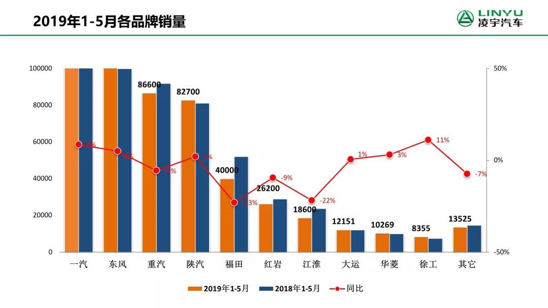 5月重卡以銷售10.9萬輛結(jié)束,環(huán)比下降8%,同比下降4%。重卡市場2019年1-5月的月均銷量為11.06萬輛,比上年同期的11.2萬輛下滑1%。從累計(jì)銷量來看,重卡行業(yè)1-5月共計(jì)銷售55.34萬輛,比上年同期的56萬輛下滑1%。