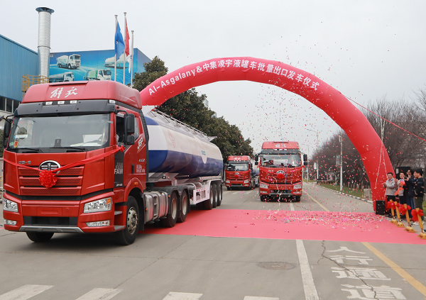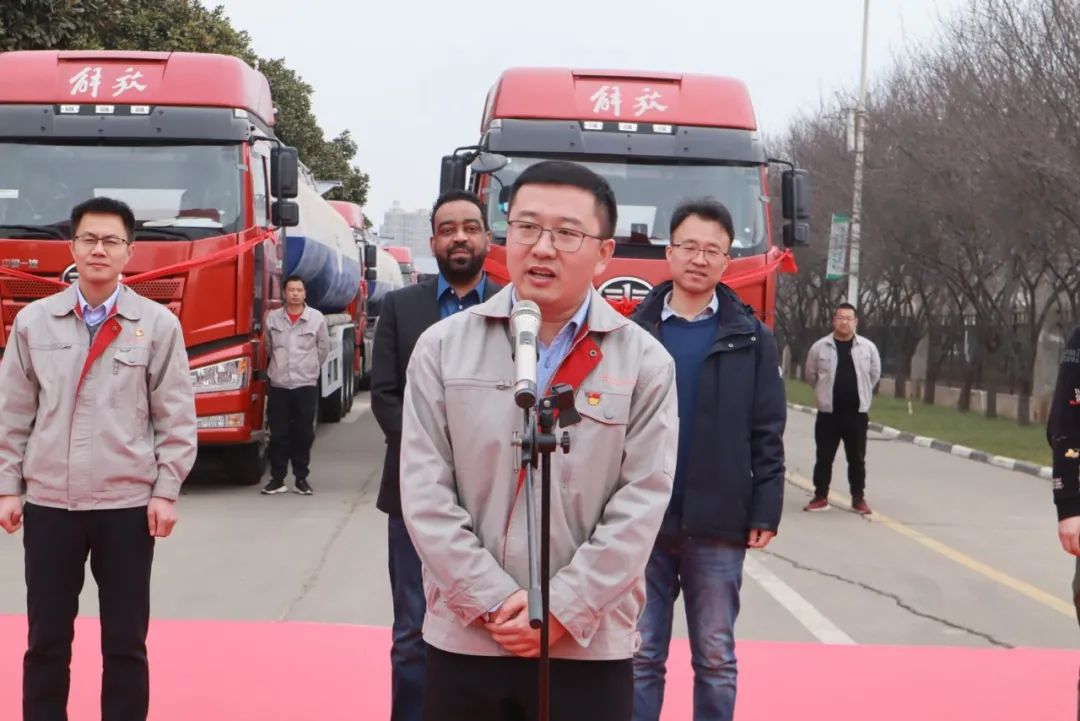 3月至,春如期。3號上午,凌宇廠區(qū)東廣場處人頭攢動,熱鬧非凡,十余輛嶄新的液罐車頭戴紅花,整齊排列在廠區(qū)道路上蓄勢待發(fā),它們即將跨越萬里奔赴非洲蘇丹。