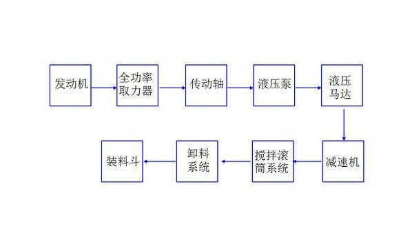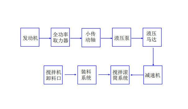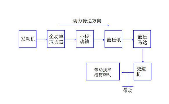 取力器將發(fā)動機的動力通過小傳動軸帶動液壓泵液壓馬達轉動,經過減速機帶動攪拌桶轉動。在運輸混凝土的途中,需要保持攪拌罐每分鐘1-3轉的低速轉動,以保證混凝土的勻質,同時防止混凝土的離析,稱為攪動(俗稱攪拌)。