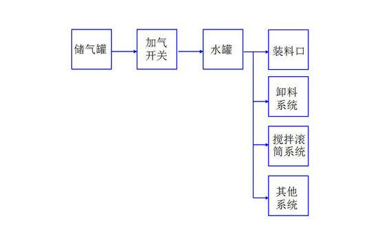 通過制動系統(tǒng)的儲氣筒給水罐加壓,水流經過加壓清洗攪拌罐系統(tǒng),裝料口,卸料系統(tǒng)等。